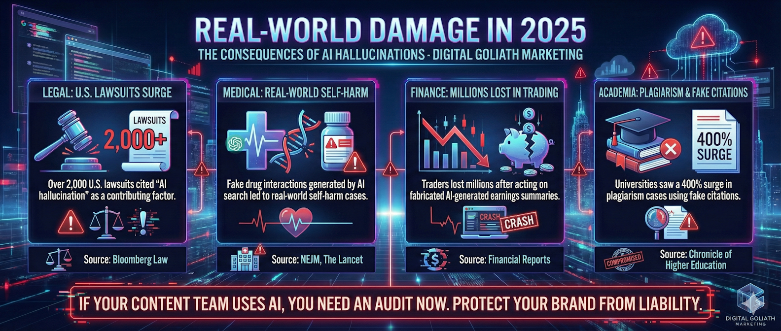 Medical: Fake drug interactions generated by AI search led to real-world self-harm cases (NEJM, The Lancet).