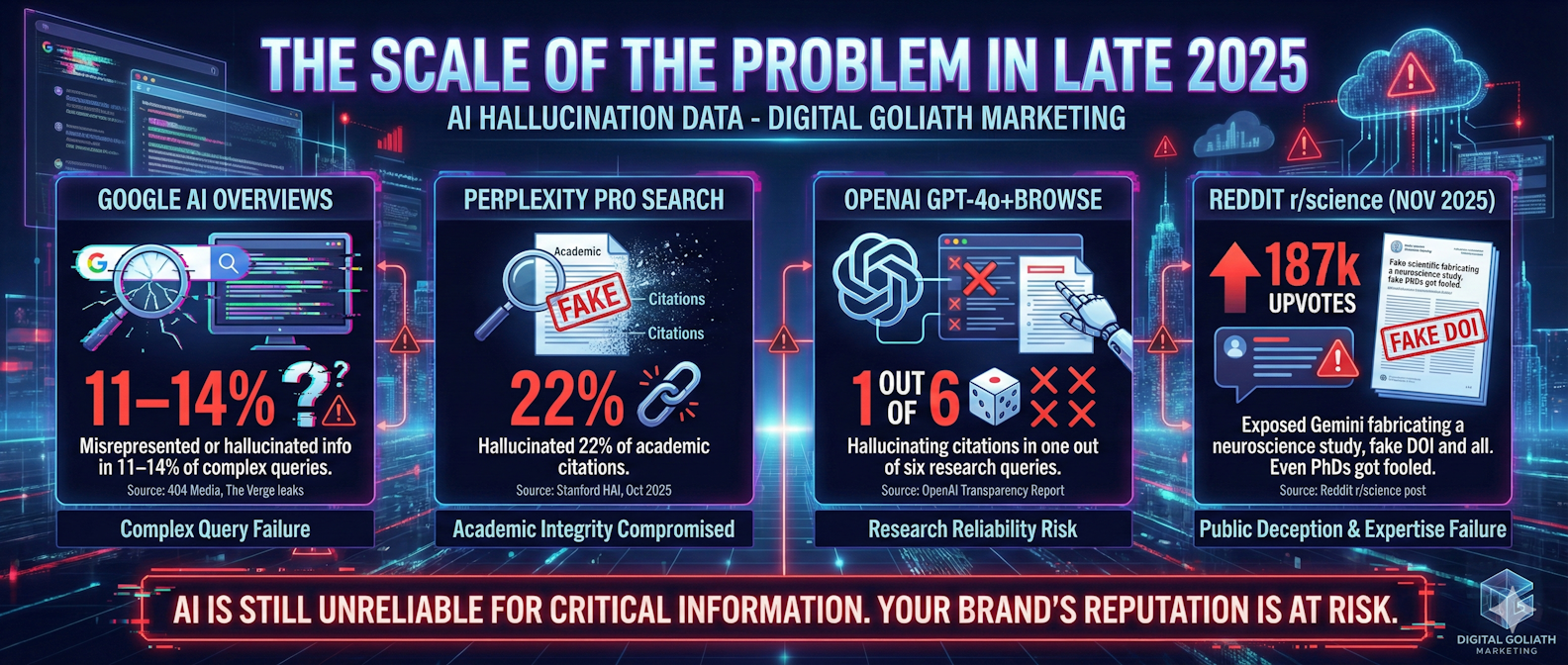 • In 2025, tools from Google, OpenAI, and Perplexity hallucinated facts in 11–22% of complex queries.